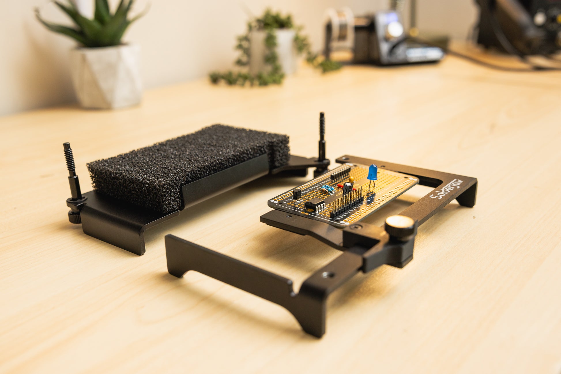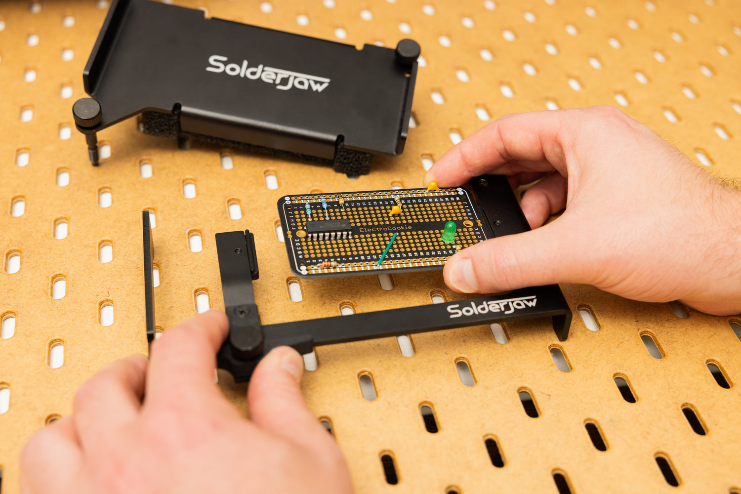 The SolderJaw CSJ-1 adapts seamlessly to both through-hole and surface mount components, offering unparalleled versatility. Whether you're working on a solderable breadboard or a custom PCB, the CSJ-1's innovative design ensures a secure hold without the hassle of bulky vises or flimsy helping hand devices.