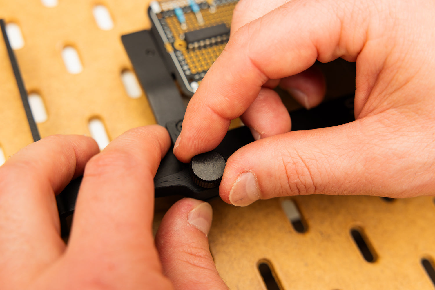 Slide the left jaw into place, and while holding tension with your left thumb, tighten the clamp thumbscrew to secure the PCB in place
