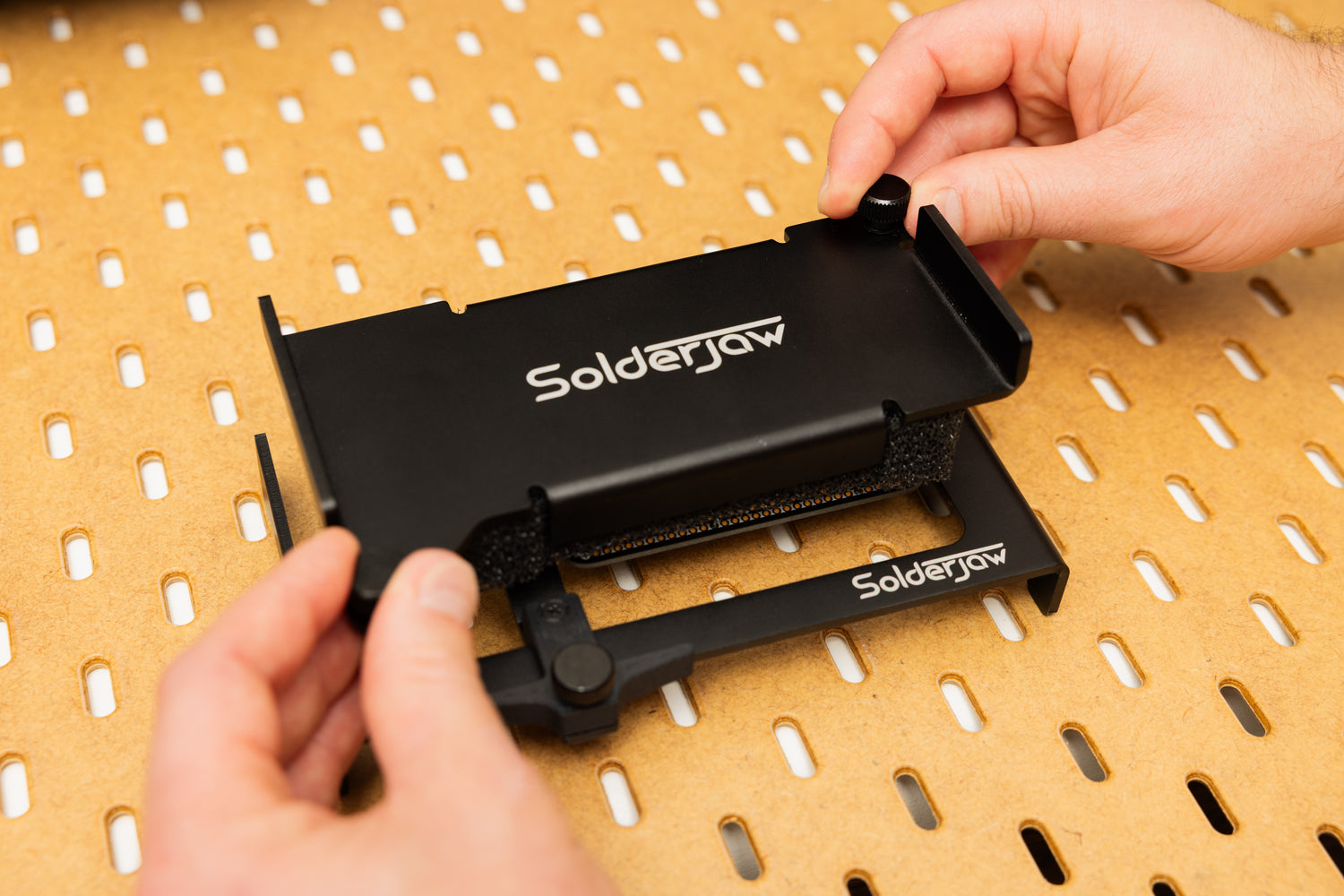 The CSJ-1 is a patent-pending design to solve the problem of holding one or more components in place while soldering. The device securely holds printed circuit boards (PCBs) and custom circuit boards. Using its conforming membrane, the top conforming plate conforms around any components on the board, securing them in place as the device is turned over for soldering.